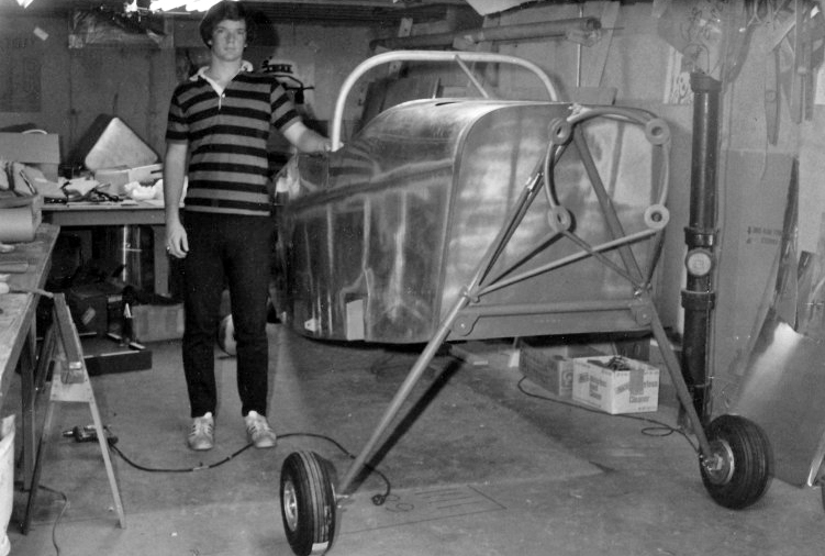 Me standing next to the fuselage on gear with engine mount temporarily attached.