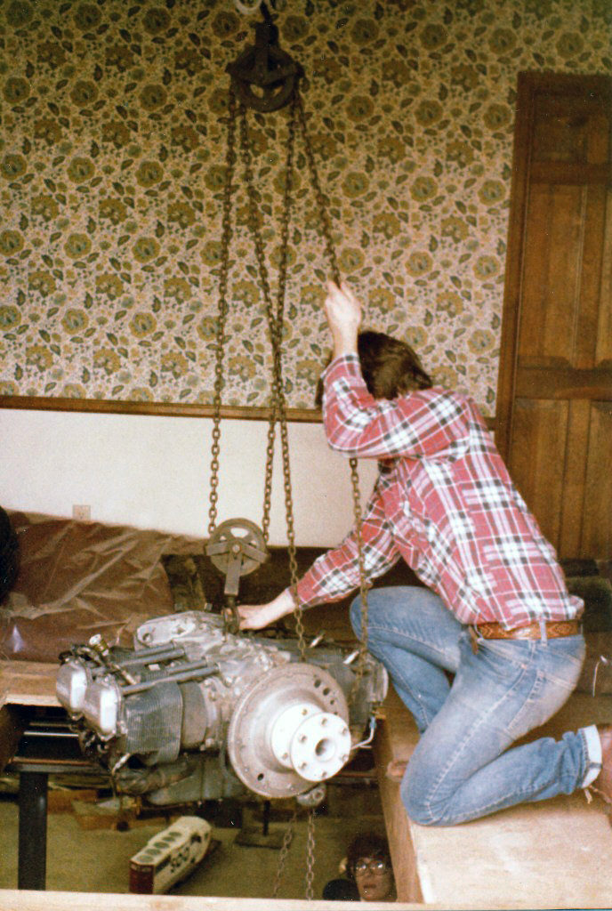 The Lycoming IO-360 engine emerges from the basement. Dig that 1970s wallpaper! I think that was our real estate agent looking up from the basement.