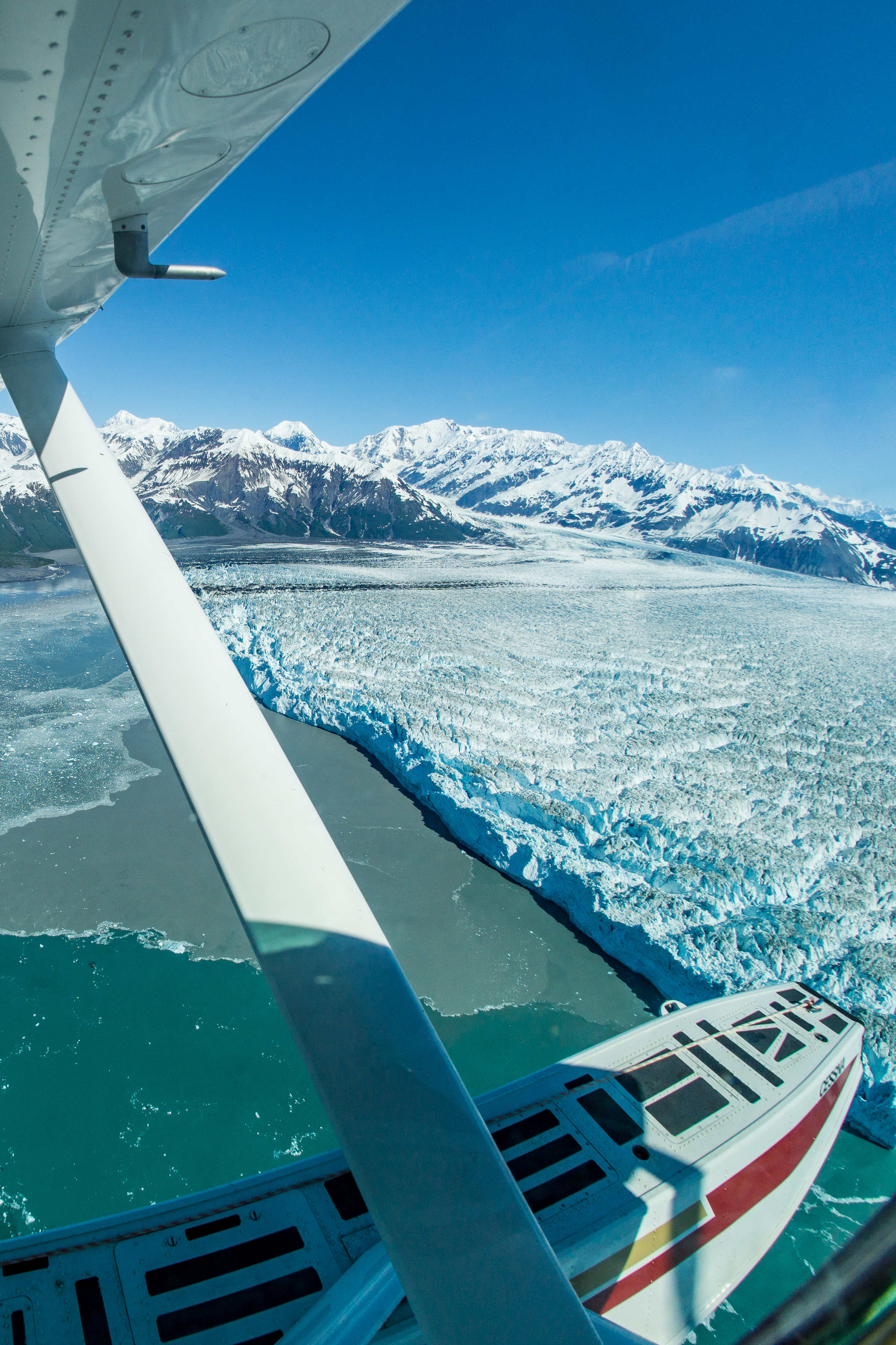 After a quick fuel stop in Valdez, we continued on via Cordova and the coastal mountains. This region is home to 10,000-foot peaks and the well-known Bering Glacier, Bagley Ice Valley, Yahtse Glacier, and Malaspina Glacier. As far as the eye can see, the world is filled with glaciers, ice fields, and turquoise lakes.