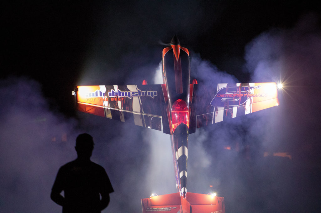 Jase owns 15 planes, but the one he’s flying at Oshkosh is based on the Edge 540. Manufactured by Extreme Flight, one of his sponsors, the 28-pound plane is a gas model with nine servos to provide control; 120-cc, two-cylinder engines; and a 106-inch wingspan. He adds lights and a smoke system for night flying.