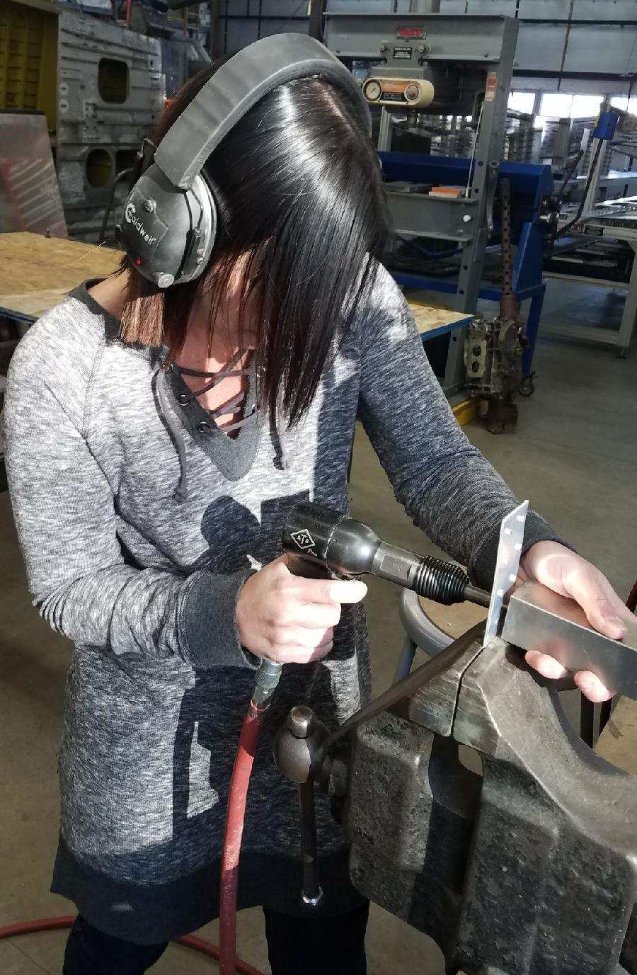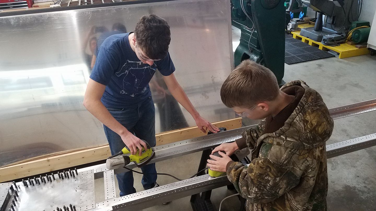 Founder Patrick Mihalek teaching youth Keagan how to squeeze rivets