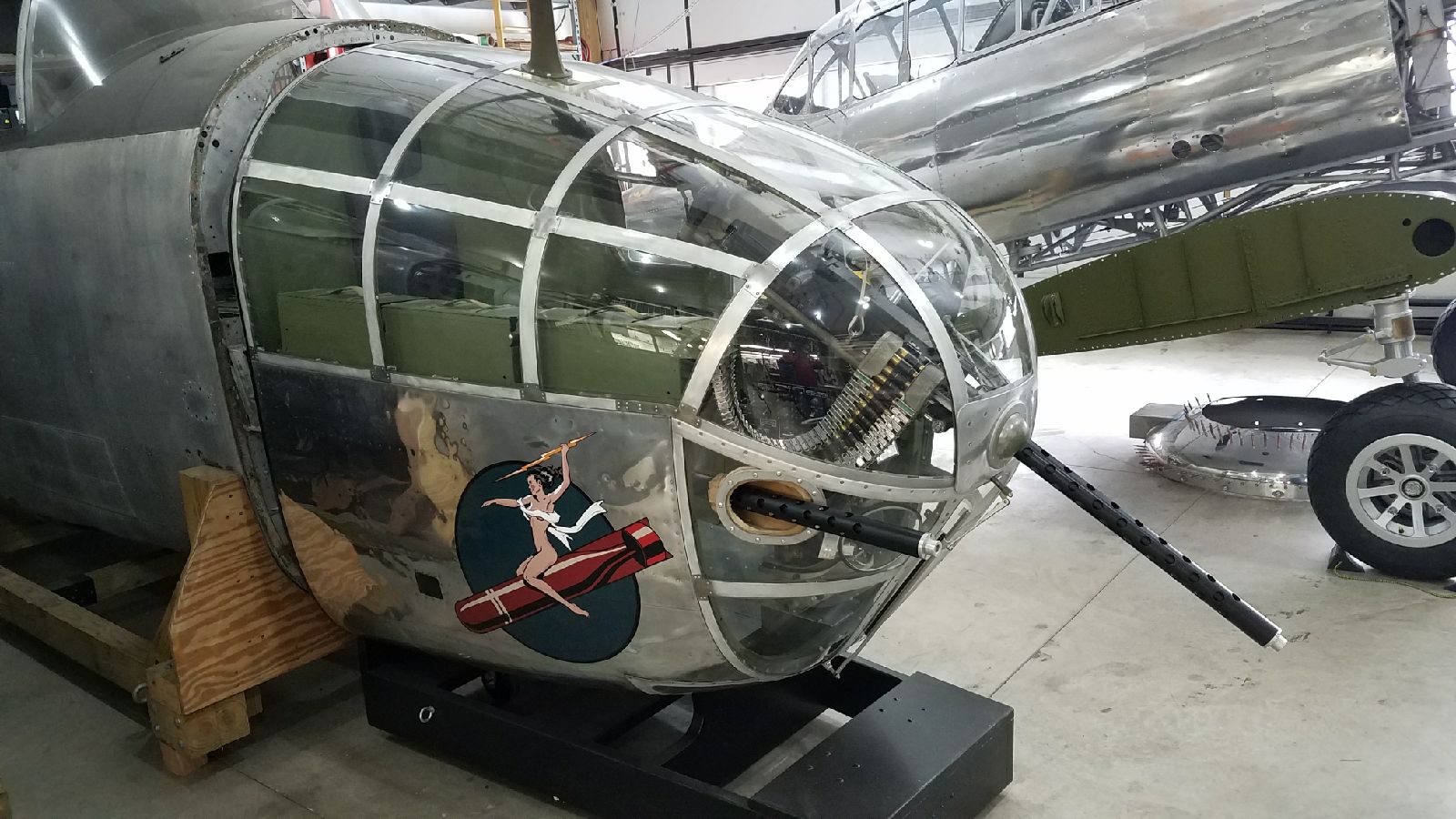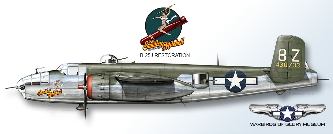 The restoration of Sandbar Mitchell is a multi-year project, requiring extensive work. Each section of the aircraft is being carefully disassembled and repaired to the original North American aviation drawings, largely with help from the youth involved in the Warbirds of Glory mentorship program. Currently, the glass nose has been restored and progress is being made on the fuselage center section.