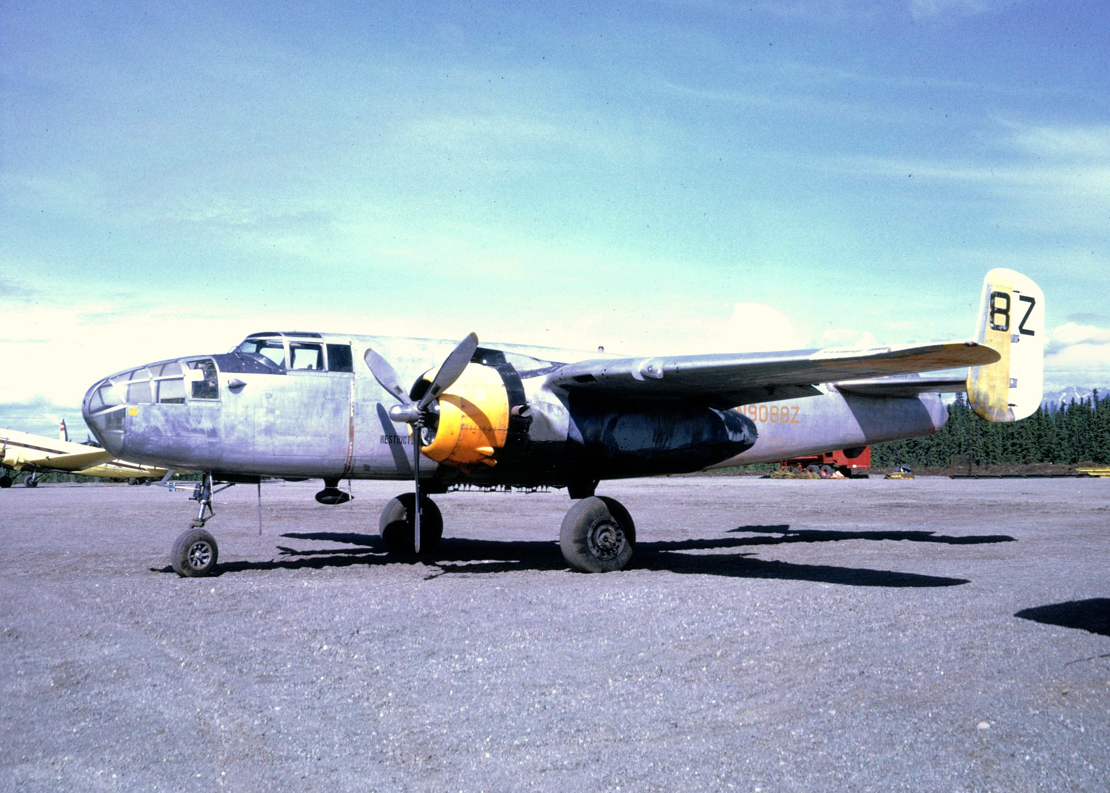 On June 27, 1969, the B-25 had a multi-engine failure on takeoff from Ladd Field in Fairbanks, and made an emergency gear-up landing on a sand bar. After being abandoned for 44 years, the Warbirds of Glory Museum recovered it in 2013. The restoration will honor the 488th Bomb Squadron  of the 340th Bomb Group, as ship 8Z.