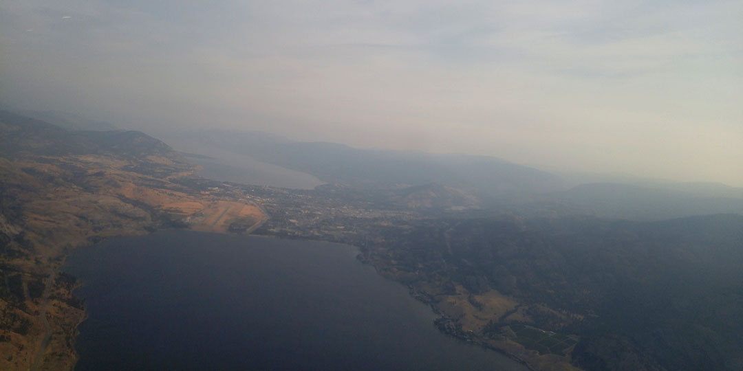 Not wanting to dawdle when there was favourable weather, we flight-planned for Penticton direct. Again, we experienced visibility of around 10 miles for the whole flight. Downward visibility was excellent for evaluating potential landing spots. We never did need any of those landing spots as the Jabiru just kept singing. We were comfortable with the visibility that we had and knowing that we were clearing the peaks by 2,000 feet. We landed at Penticton Regional Airport around 2345 Zulu on a warm afternoon, watching kitesurfers on the lake as we slid down final. However, with the sun setting to the west, visibility in the smoke was going to get more difficult, so we decided to wait until morning before carrying on.