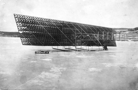 Selfridge’s death hit AEA hard, but they decided to keep at it, and extended their charter for an additional six months. Their next project was McMurdy’s design, which would come to be known, thanks to some silver balloon material they bought from Goodyear, as the Silver Dart. Evolving as it did from the previous AEA designs, it was a biplane with a rear rudder and twin canard elevators, tricycle landing gear, and this time powered by a water-cooled 35-hp Curtiss engine in a pusher configuration. Silver Dart was test flown a few times in Hammondsport and then shipped to Baddeck. On February 23, 1909, with McMurdy at the controls, it became the first powered heavier-than-air aircraft to fly in Canada. The Dart flew extensively after that, until it was destroyed in a landing accident during a military demonstration several months later.