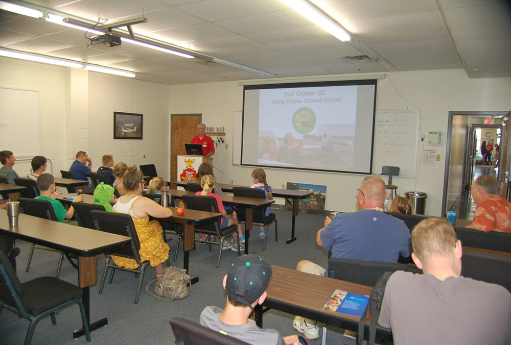 A typical Chapter 382 Young Eagles rally starts with a short ground school that explains the EAA Young Eagles program, how airplanes fly, how the flight controls work, what the instruments show, and shares the different scholarship opportunities for Young Eagles participants. The ground school instructor also explains what the Young Eagles can expect when they meet their pilot and go to the airplane. Parents are encouraged to attend the ground school, and, typically, the Young Eagles and parents ask a lot of questions.