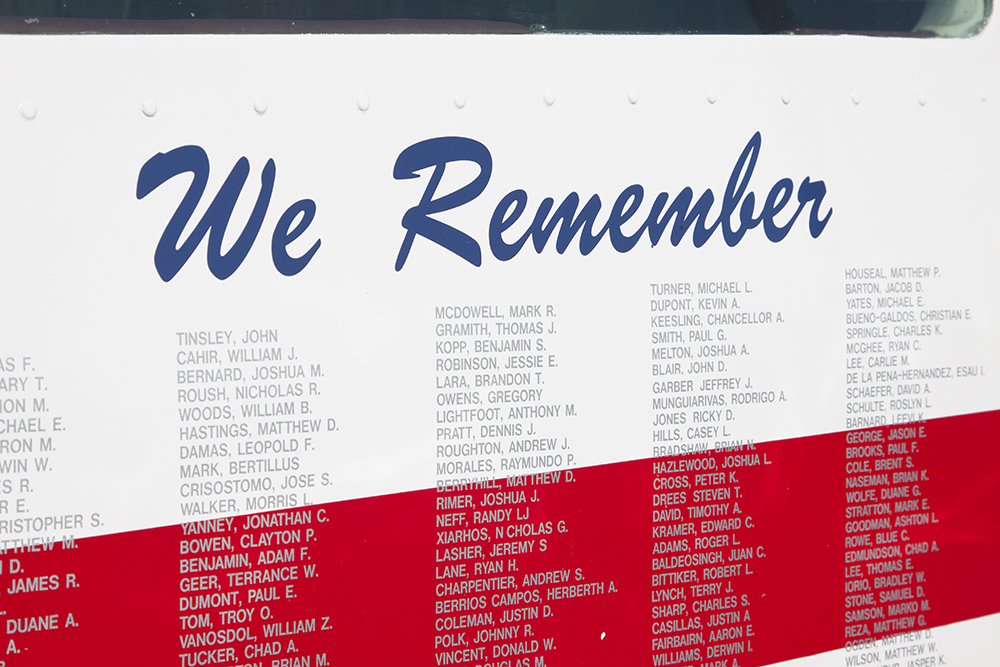 “One of the things that every single family wants is to know that the sacrifice that their dad or their mom, their husband or wife made is not forgotten,” Buck said. “So this project here, the act of putting all the names of the fallen on the plane, keeps their name alive and reminds the public of that sacrifice. The meaning that it holds for the families is pretty remarkable.”