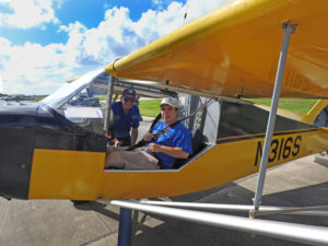 John Weber, EAA Chapter 534 Aviation Youth Program director, makes sure program participant Mateo Colmenero, EAA 1200734, is tightly strapped in for the flight. Since John is a light-sport flight instructor he is used to having his students in the left seat as “pilot in command.”