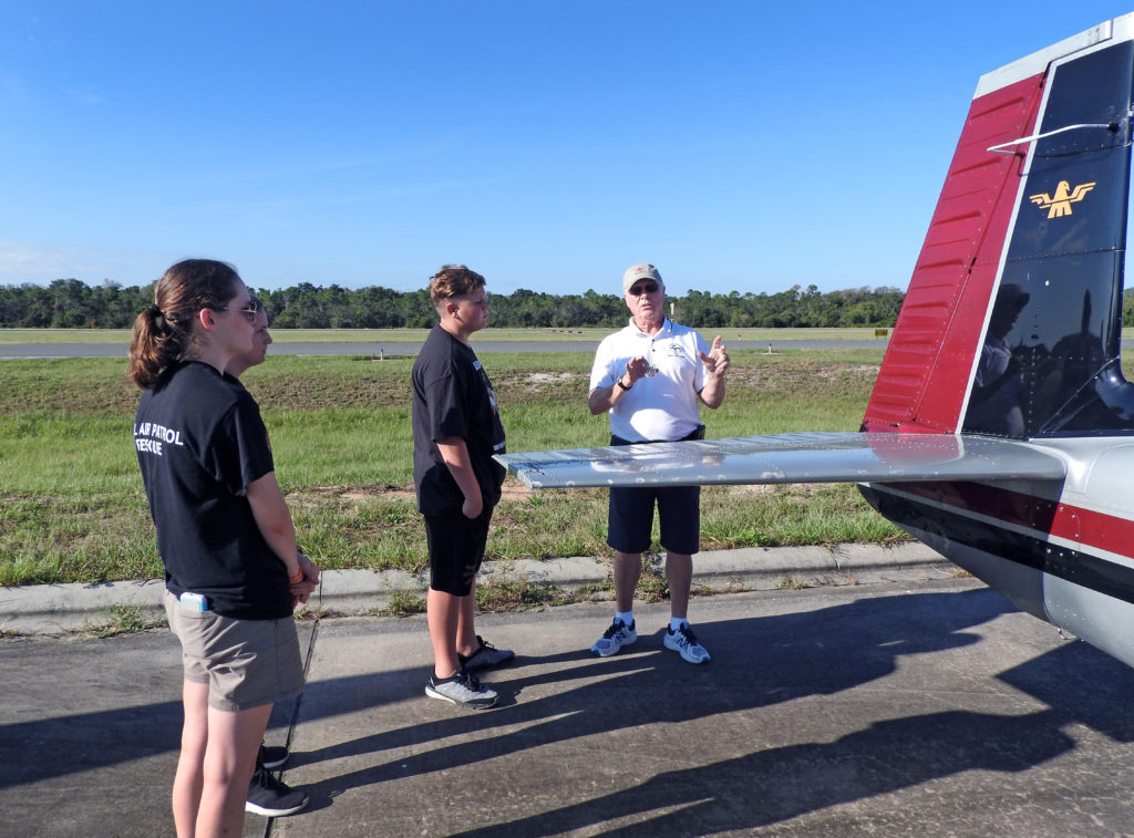 Pilot Jim Waymire explains the aerodynamics of his airplane’s elevators and rudder to his Young Eagles. As of publication, Jim has flown 299 Young Eagles.