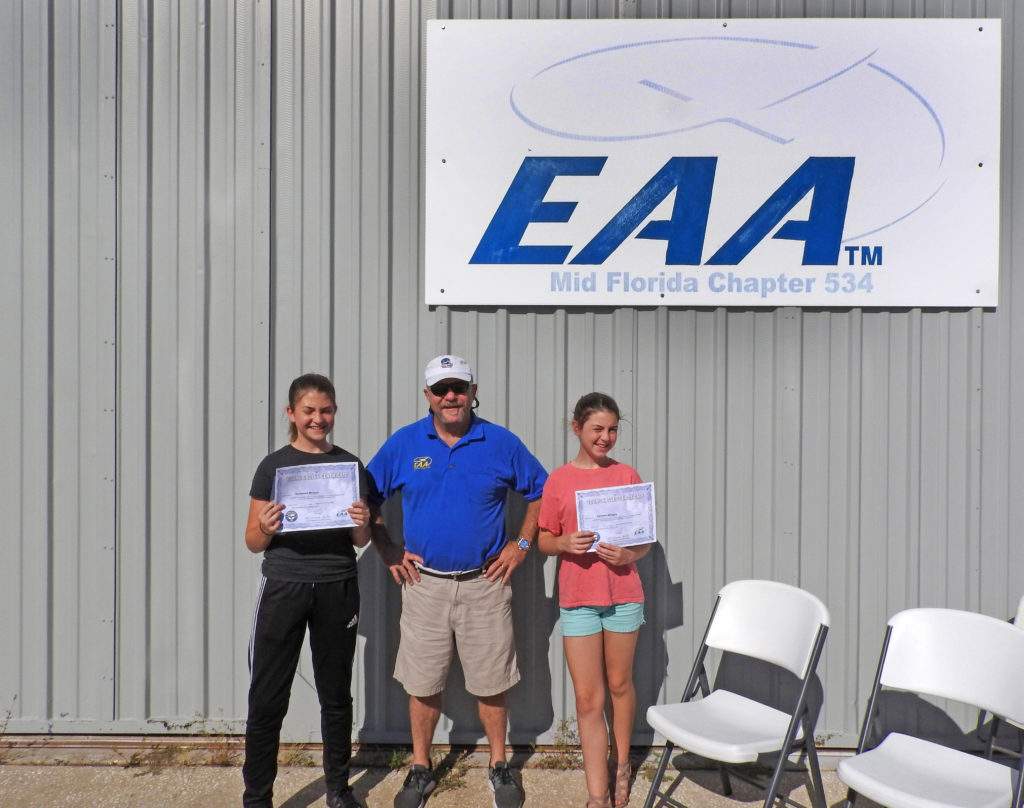 Young Eagle Samantha Miraglia, left, and her sister Carmella proudly display their commemorative Young Eagles certificates with their pilot Joel Hargis.