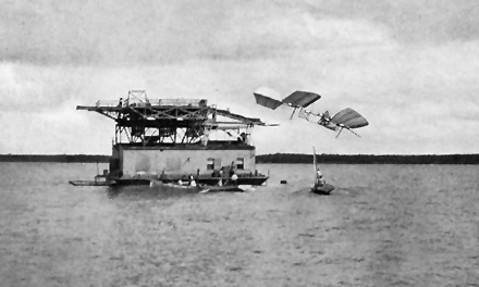 The Wrights’ most serious competitor was inarguably Samuel Pierpont Langley, then the secretary of the Smithsonian Institution. He’d built and flown a powered model of his aircraft, the Aerodrome, and on October 7, 1903, his test pilot, Charles Manly, attempted the first flight of the full-scale airplane. The Aerodrome was launched via catapult off of a houseboat in the Potomac River — rather, it was launched off of a houseboat into the Potomac River. The second attempt, two months later, also failed, just nine days before the Wrights’ history-making success at Kitty Hawk. The reasons for the Aerodrome’s failure, not to mention the fact that the Smithsonian touted Langley’s attempts as a success until 1942, are an interesting topic for another day.