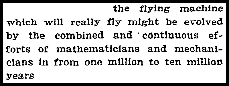 “Hence, if it requires, say, a thousand years to fit for easy flight a bird which started with rudimentary wings, or ten thousand for one which started with no wings at all and had to sprout them ab initio, it might be assumed that the flying machine which will really fly might be evolved by the combined and continuous efforts of mathematicians and mechanicians in from one million to ten million years,” he wrote.
