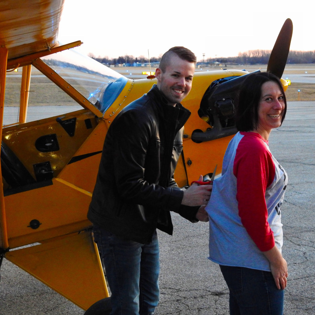 Cutting the shirt tail after Sara’s J-3 Cub solo (her first training airplane)