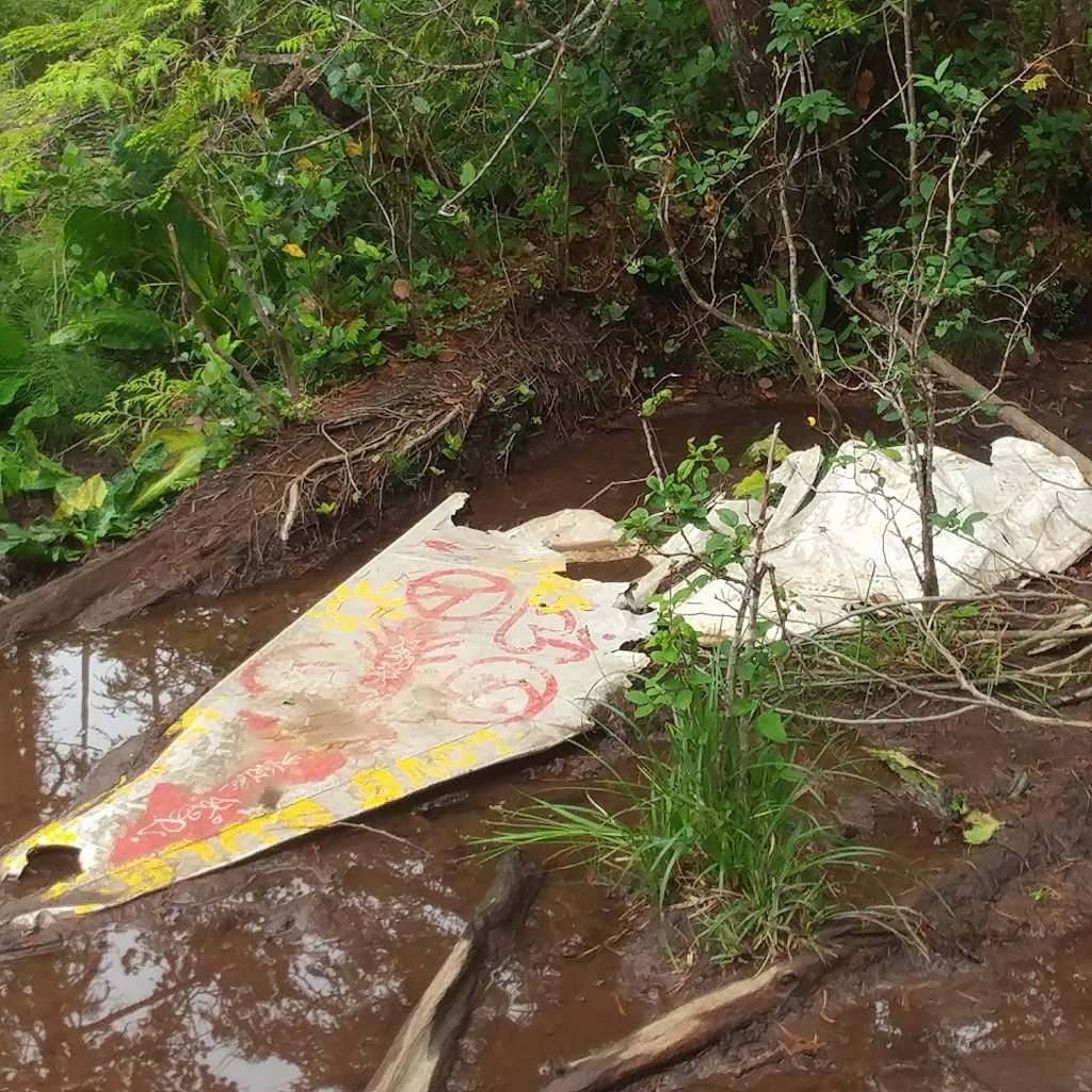 And then the empennage of the abandoned wreck peeks out of the forest.