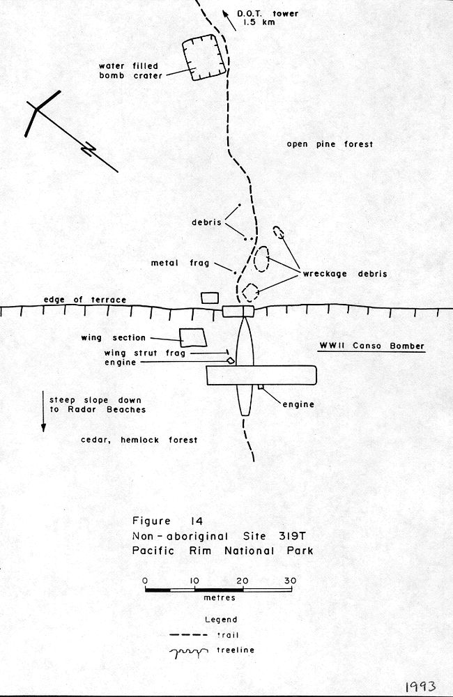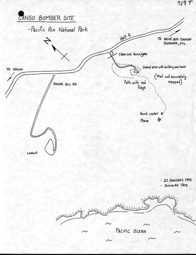 The wreckage was never removed, and to this day serves as a ghostly reminder of that day in 1945. The site is about a 2-kilometer hike into the bush on well-marked trails. Starting at the 15th telephone pole south of Radar Hill on Route 4, a well-groomed climbing path first leads to a graffiti-covered abandoned building believed to have been a communication shack.