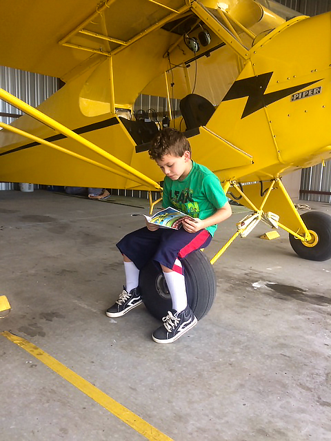 I own N87714, which is a 1946 Piper J-3 Cub with 85 hp. Tayten went for his first flight on August 10, 2017. In one picture you may notice he is reading a book. The book is How to Fly a Piper Cub. I thought we were just going for a ride and yet he wanted to learn to fly that day. He would not settle for just a ride. So at the young age of nearly 7 I handed him that book while I was working in the hangar and he sat down on the tire and read it cover to cover.