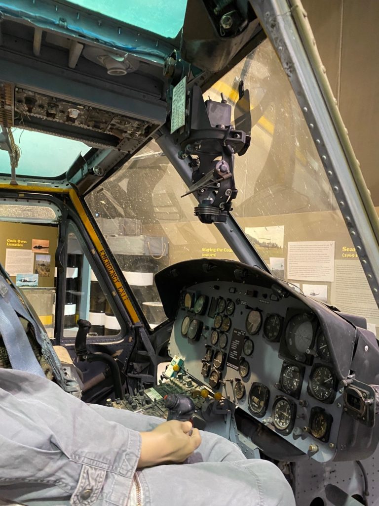 Pat arrived in time to start working on Veterans Day. Our museum was admitting veterans in free of charge that day, and the stage was set for a powerful reunion. As we were working on the Huey in plain sight in the exhibit, veterans would walk up to share their stories of flying in them. One gentleman asked if he could feel the floor in the rear cabin. As he put his hands on it he mentioned that he would have nightmares when he got home from Vietnam about being wounded on the floor in the back of a Huey. “Putting my hands on this and feeling it helps,” he told us. He later had the chance to sit in his old seat and hang his feet out over the troop bay, just as he did in the 1960s.