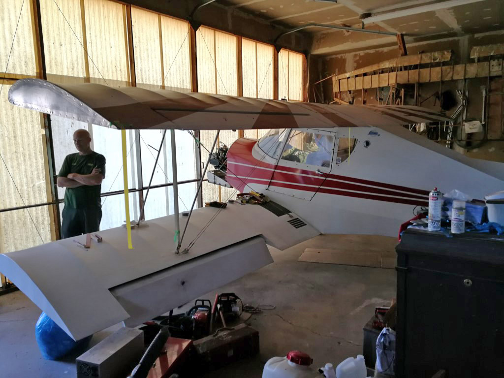 Each day during this time, he and I would be in the shop at 7 a.m. and I spent my days assembling and riveting together the wing panels. Occasionally, I did some flying with an instructor in a high-wing monoplane version called the Lightair Coupe. This machine flew well but with a with a rather mediocre roll rate. The Beachboy on the other hand has four ailerons and a span of 24 feet so the roll rate is wonderful!