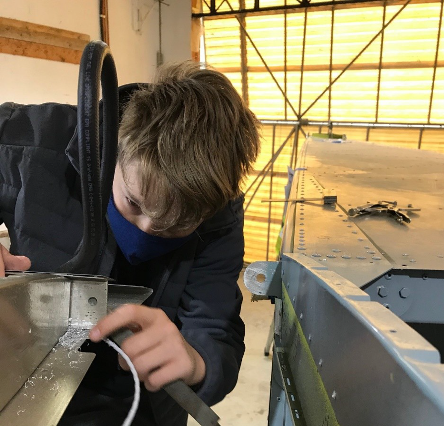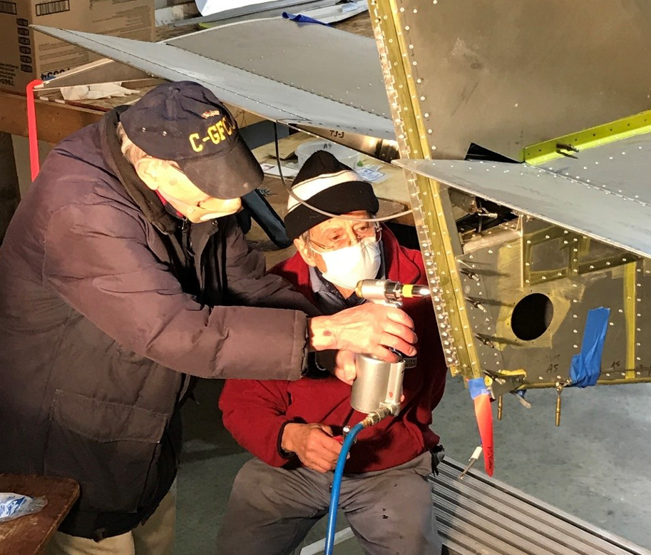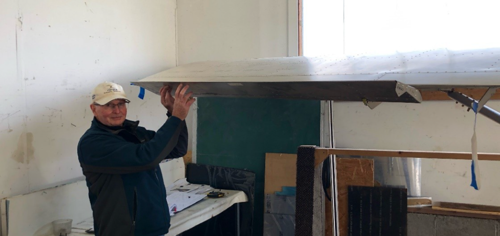 While work was progressing on the wings, struts, and flaperons, the empennage was reattached to the rear fuselage and final fitting checked. The remaining task involved riveting the rudder hinge assembly to the inside and sides of the tail fin. Irving and Edgar undertook this job with the weather getting colder in November. Apart from riveting the balance weights to the flaperons, the flying surfaces are now installed and work can focus on navigation lights, wiring, connecting brake lines, and running a fuel line up to the firewall, installing the adjustable seat pans, the seat frames, the central console, and many more small jobs. There is lots to do and with a tarp over the cockpit and a heater work can continue through the winter.