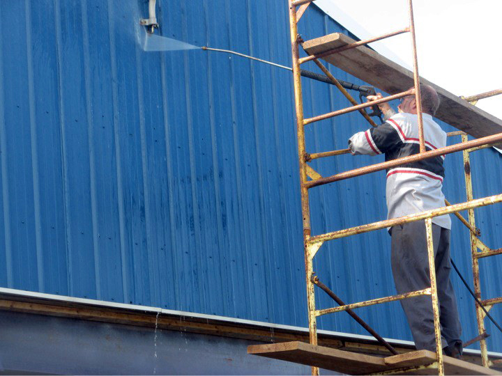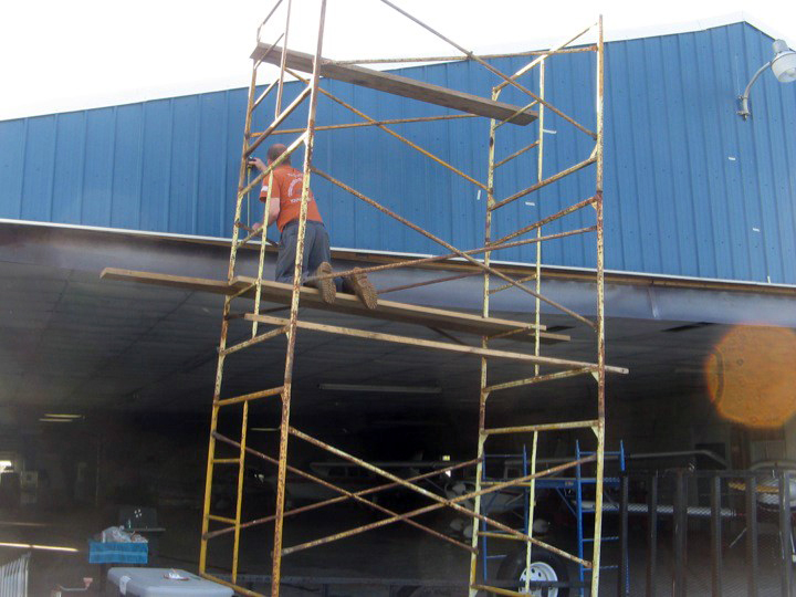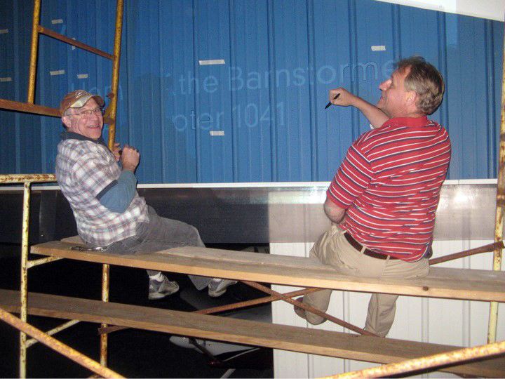 Chapter members gathered for an afternoon/evening cookout and the first phase of the job. The hangar is covered with blue steel siding, and a hot-water pressure washer was used to remove 40-plus years of dirt and grime. After drying, the locations and sizes of the lettering was marked on the siding with small pieces of masking tape. A section of scaffolding was rolled along the front of the hangar and served as a good platform for the work.