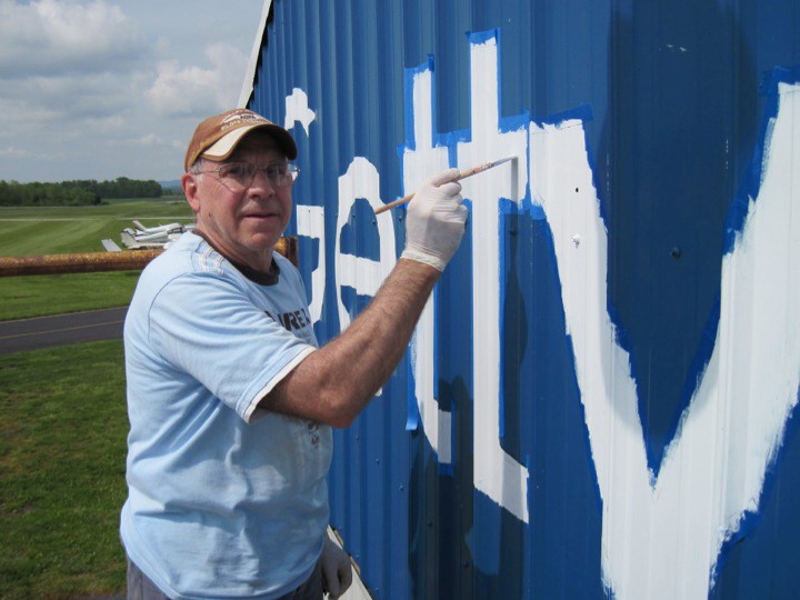 The group decided to improve things by painting identifying lettering on the main hangar so visiting pilots would have information right in front of them. Resident artist Andy Lawrence went to work designing different patterns for the chapter’s proposal. One design was agreed upon and the plan was finalized. After getting approval from the Susquehanna Area Regional Airport Authority, (owner of the facility), a plan of action was devised.