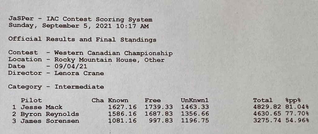 On September 4-5, the Western Canada Aerobatics Championship was held at Rocky Mountain House, Alberta (CYRM). The event has been in “Rocky” on that weekend for many years. This year was the first time in recent memory that we had great weather all weekend. The event was hosted by the newly formed IAC Chapter 137. The event attracted nine pilots from Alberta and two from Manitoba. We missed the additional interest from British Columbia this year, but we did have one new pilot, Brock Allison, EAA 1410956, fly his first-ever competition with great enthusiasm and we expect to see him back.