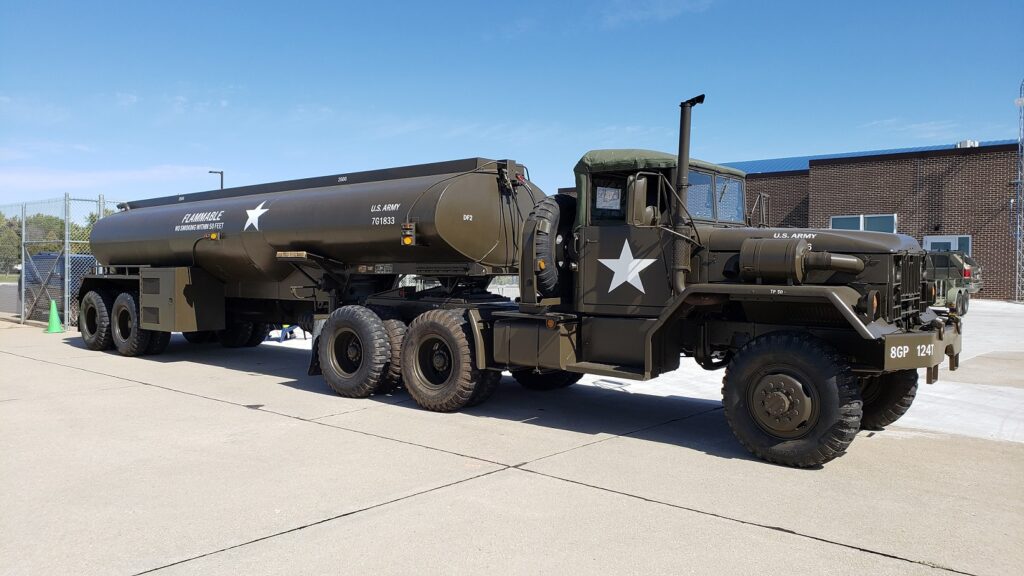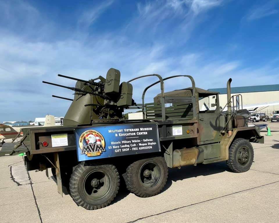 The Military Veterans Museum and Education Center brought their WWII command car, one-and-a-half ton with Quad 50, and Vietnam 5,000-gallon tanker. Thank you to Stu Tribbey for organizing this. These vehicles were a great addition to our event. Gary Otto brought two of his military jeeps, and Bill Fischer, EAA 9001812, had an awesome display of authentic gear including his jeep.