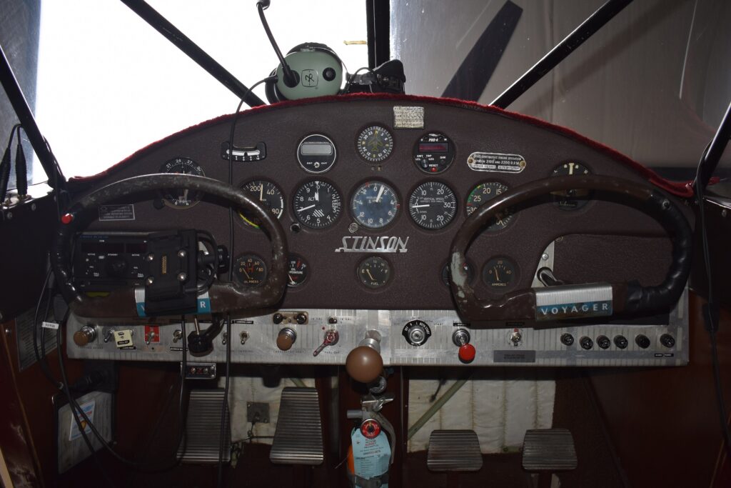 The paint job was an epic in that it was completed from start to finish in a month. This included taking the wings off and trailering it to Werner Griesbeck’s shop in Aldergrove where it was determined that while the fabric was sound, it did require a thorough and careful sanding to remove most of the old three-colour finish. My wife and daughter played a large role in that effort while learning not to sand through rib stitches etc. I took two weeks’ vacation, and I generally worked from early each morning until late in the day. All the metal parts were paint-stripped and repaired or restored and primed for the top coats. Masking for the vintage look took careful work in order to get the curves and lines correct. The actual painting was done by both Werner and I with me having to put my money where my mouth was. After all, I should know all about this sort of thing having sold both spray equipment and paint for the previous 30 years. Fortunately I had done enough demos and paid close attention in the classes that I had taught that somehow I made it work. I did however “sign” my work with a run when painting the fiberglass wing tips one Sunday afternoon prior to going out of town for a week on a business trip. Werner got to sand those out that week and repaint them while I was away — three times as he also ran the paint off twice. Large registration letters were painted on the top and bottom of the wings but I drew the line at putting them on the side as per 1946. There I went with six-inch letters under the Stinson logo on the fin.