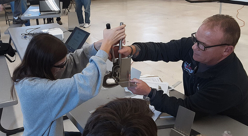 Immediately following lunch, Frank Galella, operator of Lincoln Park Aviation, led our Young Eagles through the sheet metal project, building an aluminum cellphone stand. Starting with a blank piece of aluminum, Frank guided each Young Eagle through the following processes: