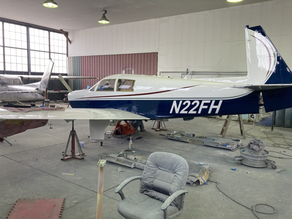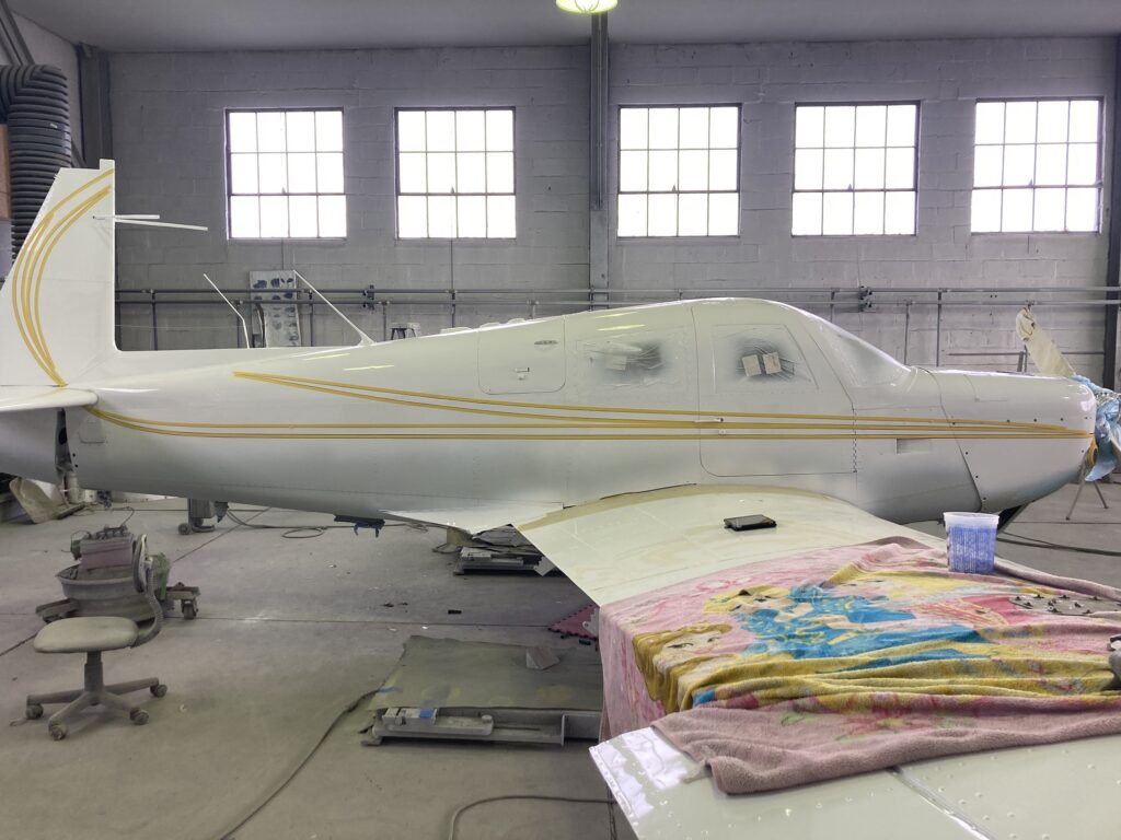 Over the years of painting, Bryan had a keen eye for what “worked” and what didn’t on the Mooney. After several weeks of sharing photos, we both agreed on a paint scheme that worked. About halfway through the process, I had stopped by to look at the progress, the bodywork, the repairs, etc. At that time, we also finalized the colors and worked out the remaining details.
