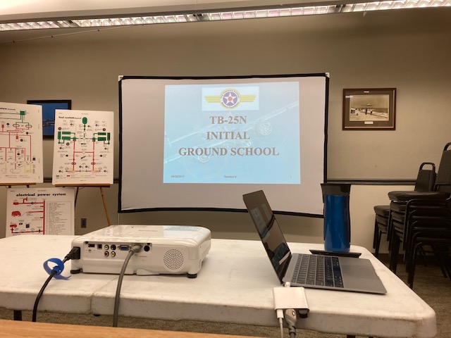 We continued with the ground school, starting with a brief history of the B-25 and Panchito, and then reviewing the systems. They included time for breaks, and we had a working lunch, which they provided. We finally finished by about 18:00. Then, over to the hangar to see the airplane — finally!
