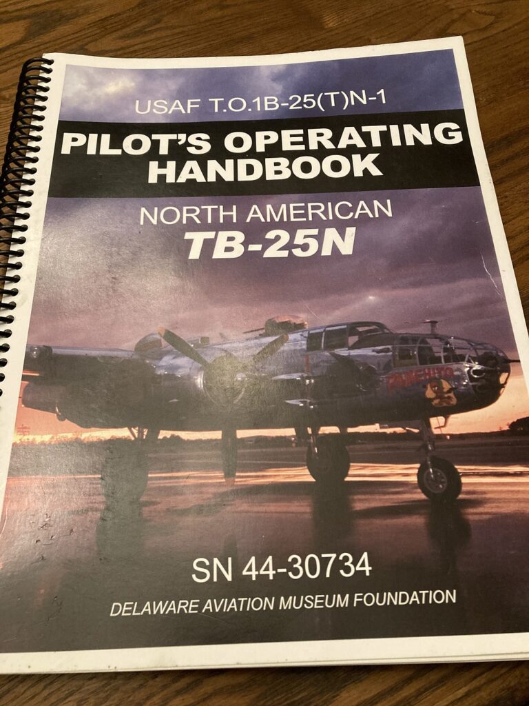 They sent me an application, which asked for my pilot credentials, flight time, along with shirt and pant sizes, height, and weight, to make me a custom-fit military flight suit! Cool! I completed the application and picked a class date from those scheduled for 2021. They processed my application and sent me my flight along with an official, 182-page spiral-bound B-25 training manual. This would take some time to go through.