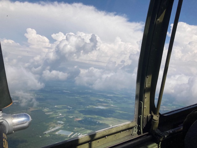 After lunch, the weather finally improved somewhat by about 3 p.m. The ceiling had finally lifted enough and we could fly! We were each going to get 1.5 hours of flight time. We needed ceilings higher than 5,500 feet to do the air work, which is done at 5,000 feet. So, they started moving airplanes around and carefully pulled Panchito out of the hangar. The first two classmates got in and they started up, taxied out, and took off! We watched. I love the sound of those Wright-Cyclone R2600-29A, 14-cylinder radial engines! I’m told that the B-25 is the loudest of the WWII bombers, even louder than the B-17 and B-24.