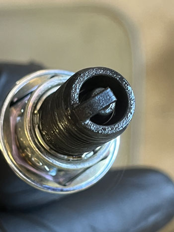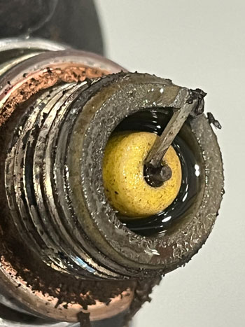 The lower spark plugs can easily get oil-fouled from oil leaking past the piston rings. Wet oil, as seen here on plug 1, is leaking past during periods of inactivity. Clean it out with a solvent. If running auto plugs on the lower plugs, just consider replacing them due to the low cost.