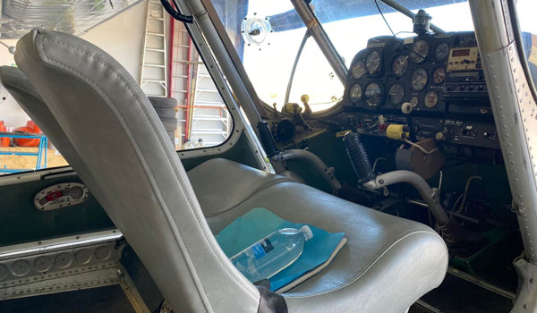 Taxiing was uneventful and I can see over the dash and cowl — one of the best benefits of being tall. The toe brakes are hydraulically operated drum type in this model and I found them to be very effective. They held me solidly in place to do a run-up and just a small jab would pivot the tail nicely to S-turn as I tracked out toward the runway. The airport was very quiet fortunately and I had the tower frequency to myself. Interesting little difference is this airplane has the PTT switch on the throttle, the throttle is on the left wall so it’s a control stick-in-the-right-hand operation. I’ve got plenty of time in my Ag Cat and other tandem single taildraggers so it felt okay but somehow just a little touchy. The elevator is feather light being so well-balanced. It’s important to have it tied in anytime your hand isn’t on the sick! The slightest tail wind could damage it. The controls are push-rod operated and ball bearing smooth.