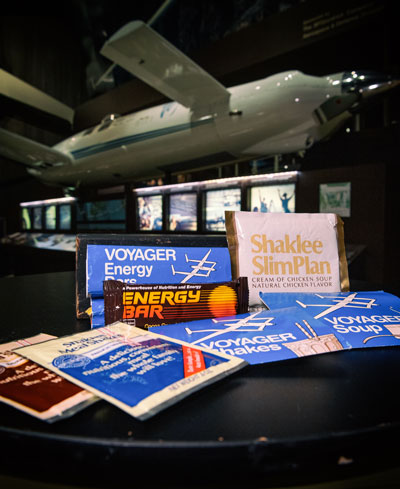 In 1986, Dick Rutan, EAA Lifetime 94971, and Jeana Yeager, EAA Lifetime 167759, made history by completing the first flight around the world without stopping or refueling, accomplishing that feat in the Rutan Model 76 Voyager. Throughout the course of their nine-day flight, the two pilots were provided a number of nutritional food items produced by the Shaklee Corp., based in San Francisco. Pictured here are Shaklee-produced energy bars and different flavored soups and shake packets. The Voyager flight wasn’t the only adventure that Shaklee helped to sponsor during the 1980s, as it provided food for mountaineering and polar expeditions, and was the “official nutrition consultant to the U.S. Olympic Ski Team” at the 1984 Winter Olympics.