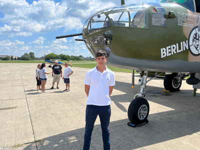 Recently EAA’s B-25 Mitchell Berlin Express landed just outside of Indianapolis for a tour stop. While members of the media were set to fly, two other seats were set aside — one for Robert Pedigo and one for Daniel Roberts, EAA 1435923. Daniel is roughly the same age Mr. Pedigo was when he started flying combat. Daniel is a recent recipient of a Ray Aviation Scholarship, which he is using to attain his private pilot certificate. He is also a lover of history. “Having the privilege to ride in the B-25 with Mr. Pedigo gave me a great perspective on training and life as he had another perspective on the time period,” Daniel said. “During the war many kids my age were training, but not for the joy of it. They were training for war and to defend our way of life.” Daniel felt the power of the history that is in the B-25 as he commented, “Kids were climbing into these stations and they didn’t know if they were going to make it back. Having the chance to take this flight with a real WWII veteran next to me is priceless.”