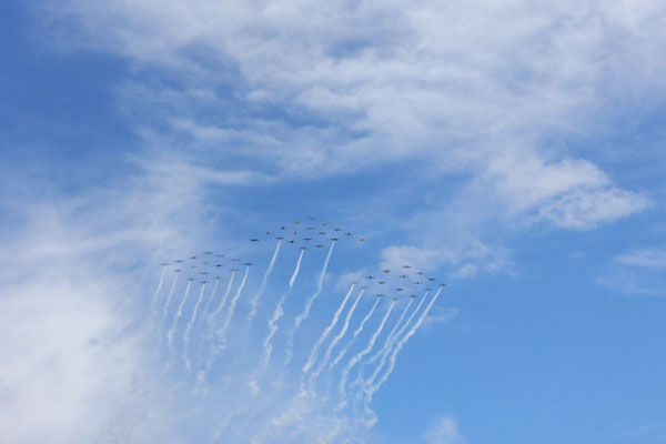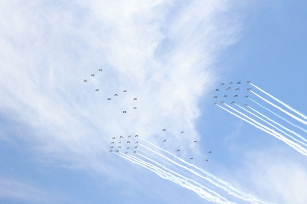 “It took 90 minutes from start up, taxi, run-up, take off, assemble, fly around in circles, join, perform reversing turns, separate, disassemble, sequence, overhead approach, land, taxi and shutdown…. For a total of three 60 second passes over the crowd.”
