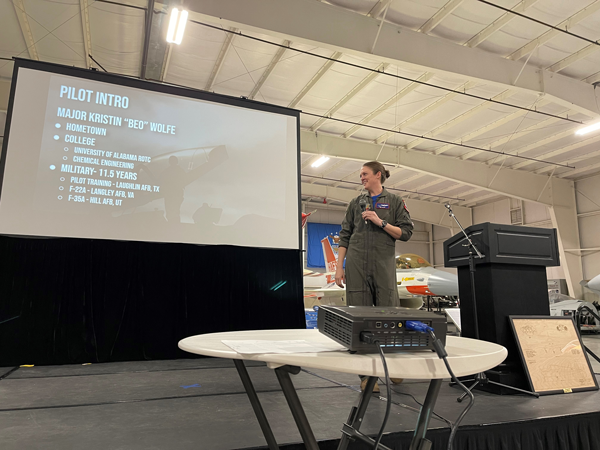 The featured speaker for the evening was Maj. Kristin ‘Beo’ Wolfe, commander of the F-35A Lightning II Demonstration Team, 388th Fighter Wing, based at Hill Air Force Base. If you attended AirVenture 2022, you most likely saw Maj. Wolfe demonstrate the Lightning II.