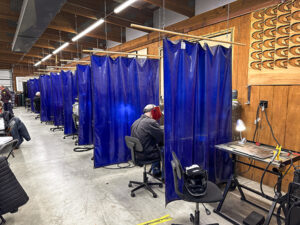 Each person had their own dedicated welding station, with heavy-duty light-blocking curtains separating them.