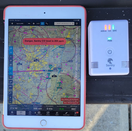 Well, the good news is that I was flying with an electronic CO detector — a Sentry ADS-B device paired with ForeFlight. I got an alert of 75 ppm which I at first questioned. How could I have CO in a pusher?