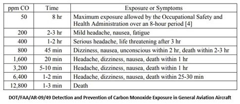 NOTE: Some CO can be expected during ground ops and slow flight. As a reference, new aircraft can be certified with a CO level of 50 ppm per (CFR) 23.831) [3]. If the level goes above 50 ppm and remains there or increases, you’ll want to pay attention to that and take appropriate action. See the table below.