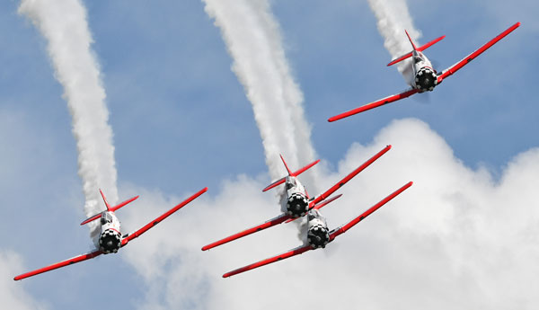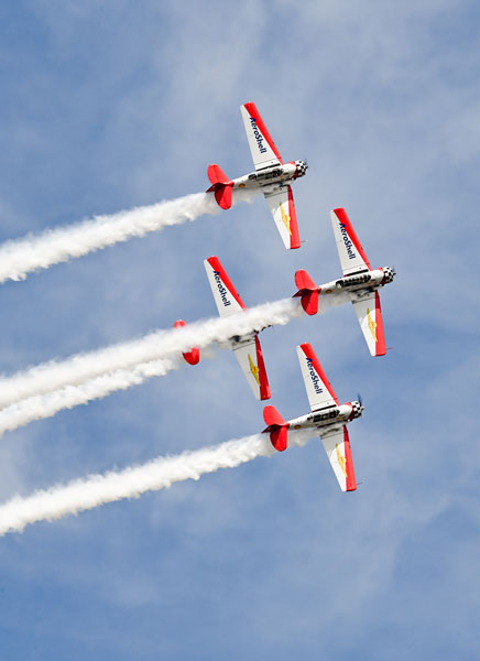 Launched in 1985 as the North American Aerobatic Team, the group picked up AeroShell as their major sponsor in 2001, and today their four red-orange and white T-6 Texans are a mainstay on the air show circuit. Set against a backdrop of smoke trails accompanied by a chorus of four Pratt & Whitney R-1340 engines, the team’s fluid performance is the essence of “up close and personal.” Fun fact: Their routine uses 18 gallons of smoke oil per airplane, versus only 15 gallons of avgas.