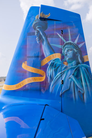 Steve’s airplane tells more of a story, from Colonial times to present day, and includes an immature eagle on one side, with Betsy Ross’ flag, George Washington crossing the Delaware, and Paul Revere’s famous ride. The other side includes a mature eagle with six Marines raising the flag at Iwo Jima and Arlington cemetery with a horse-drawn caisson. On the cowling is the Vietnam Veterans Memorial.