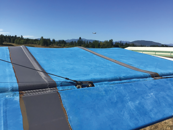 After the initial transport to the airport, I found a 1-inch fabric tear near the leading edge of the right-wing fabric. It turned out that fabric tear was a blessing in disguise because it gave me a chance to take a small sample from that highly stressed fabric area. For the tear repair I used curved sewing needles from Walmart and waxed string to sew the tear with baseball stitches in accordance with AC 43.13-1B. The fabric sample tested above the specifications given in AC 43.13, so the fabric was still airworthy. But it bothered me to leave that unprotected upper fabric out in the intense sun.