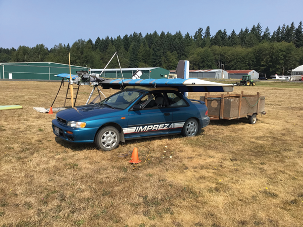 By June, I couldn’t do much more inspection or testing with it still unassembled in my yard, so I hauled it to the local airport and assembled it for the first taxi and engine power testing. I figured out a way to assemble the wings by myself by placing a 2-inch foam pad on my car roof to support the 37-pound wing as I connected the cables. That worked well, as long as the wind was calm.