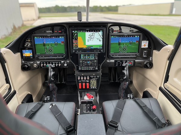 I chose a Thunderbolt IO-540 for the powerplant and a two-bladed Hartzell blended airfoil prop. I put the Electroair ignition on the right side and a mag on the left. I found I get really smooth performance operating at peak exhaust gas temperature, cruising in the low to mid teens. The performance numbers are spot on with what Van’s published. I tried to do as much as I could myself. I designed the electrical system with redundancy in mind. I have two complete electrical systems, two batteries, two alternators, and two main buses. Both normally work separately from each other, but they are bridged together with two diodes. The buses operate at slightly different voltages so they remain separated. A failure of main Bus No. 2 is no big deal; Bus No. 1 immediately picks up the slack automatically. A failure of main Bus No. 1 results in Bus No. 2 taking care of the essentials, shedding the high-load items such as the air conditioning and landing lights. I also did the engraved labeling with a little CNC engraver I found online. This took a little time as the instructions were in Chinese. After a lot of trial and error, I ended up engraving the back side of black-painted plexiglass in a mirror image. Then I painted white over the engraving, which gave 3D lettering on the front side. I had to do the instrument panel in sections due to the size limitations of the engraver.