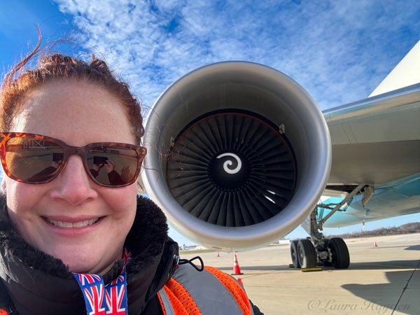 Posing with a Maersk Air Cargo Boeing 767, parked on the ramp at RFD. ORD Airport Watch was on their annual airside tour of RFD, and members had the opportunity to walk right up this aircraft! Photo by Laura Hayden