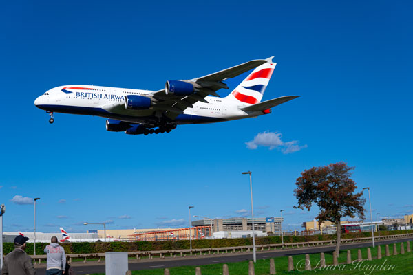 A British Airways Airbus A380 on short final for London Heathrow’s runway 27L in October 2022, from the famed Myrtle Avenue. Photo by Laura Hayden