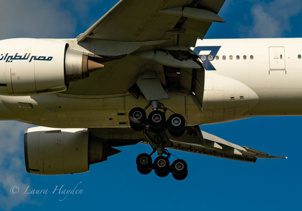 Close-up of an EgyptAir Boeing 777’s landing gear, taken as the aircraft was moments from touchdown on Heathrow’s runway 27L, in October 2022. 777 landing gear is my absolute favorite, and this set was particularly photogenic! Photo by Laura Hayden.